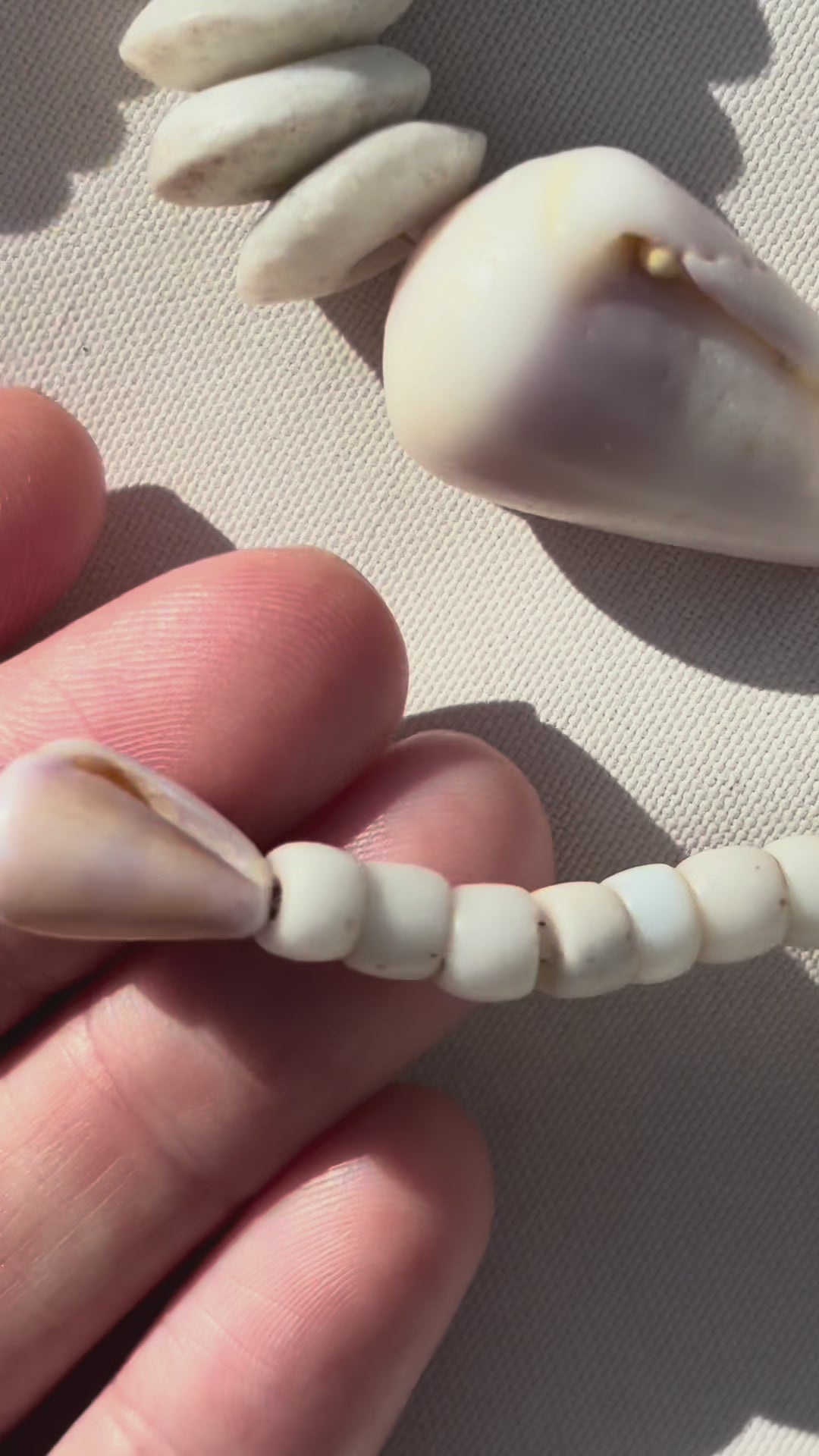 this cutie coco is a classic cream + purple cone combo in a smaller bead size. Beads are made from recycled African glass. one of a kind.
